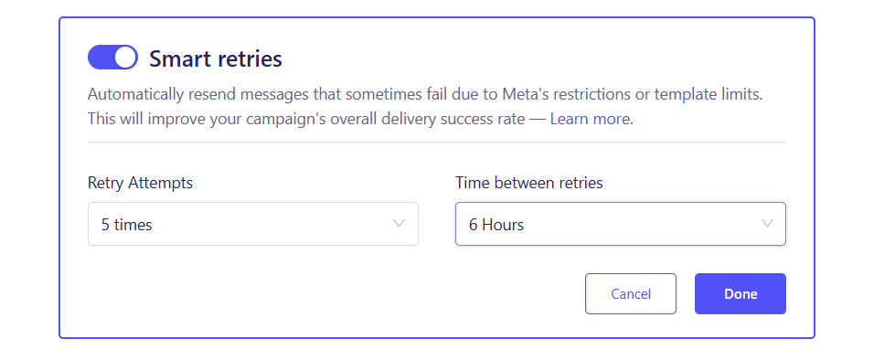 messagesSmart Retries is an essential feature designed to automatically overcome these delivery failures on WhatsApp due to Meta's throttling of message.