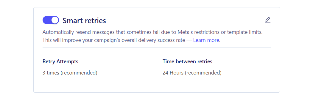 - When sending your campaign or broadcast message and reviewing the same, there will be an option to turn on ’smart retries.’