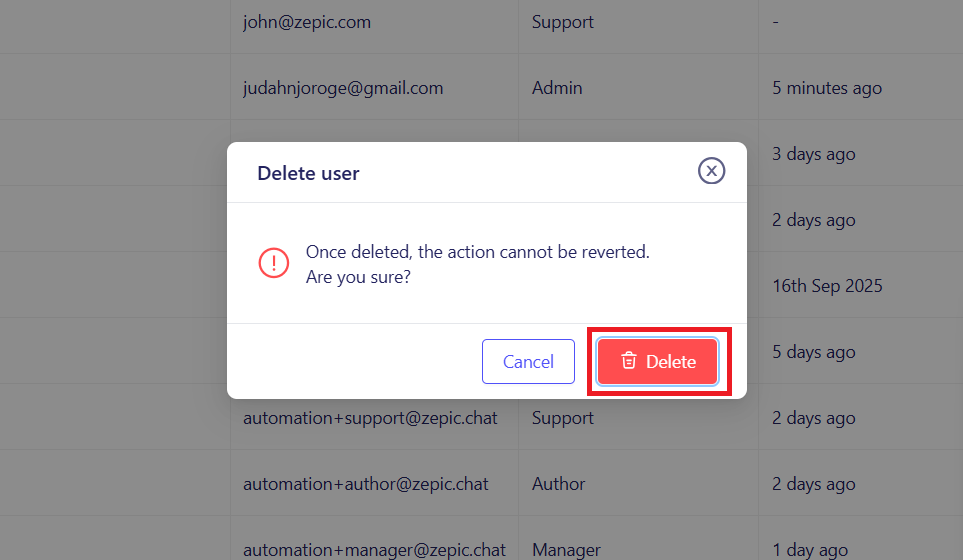 Confirm Removal: A confirmation box will appear. Click 'Delete' to permanently remove the user and revoke their access.