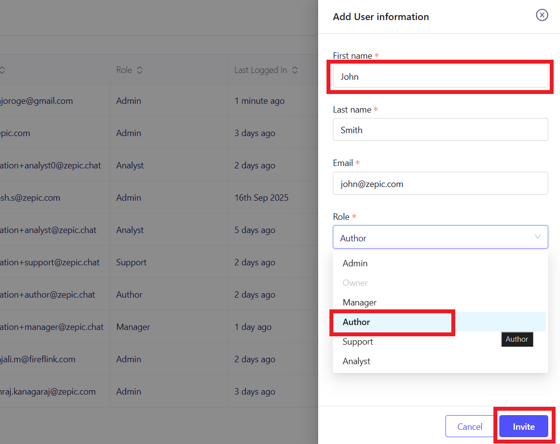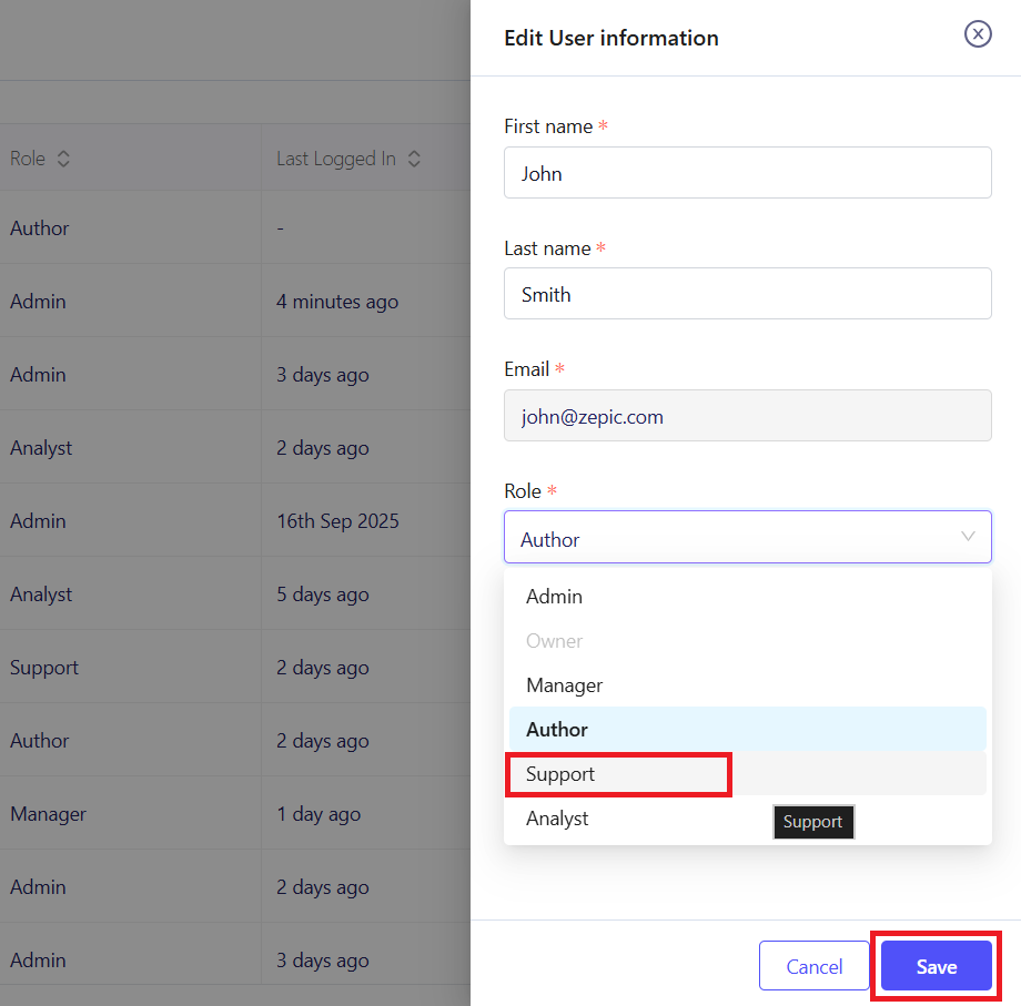 Assign a Role: Select the appropriate role from the dropdown menu (Admin, Manager, Author, Support, or Analyst).