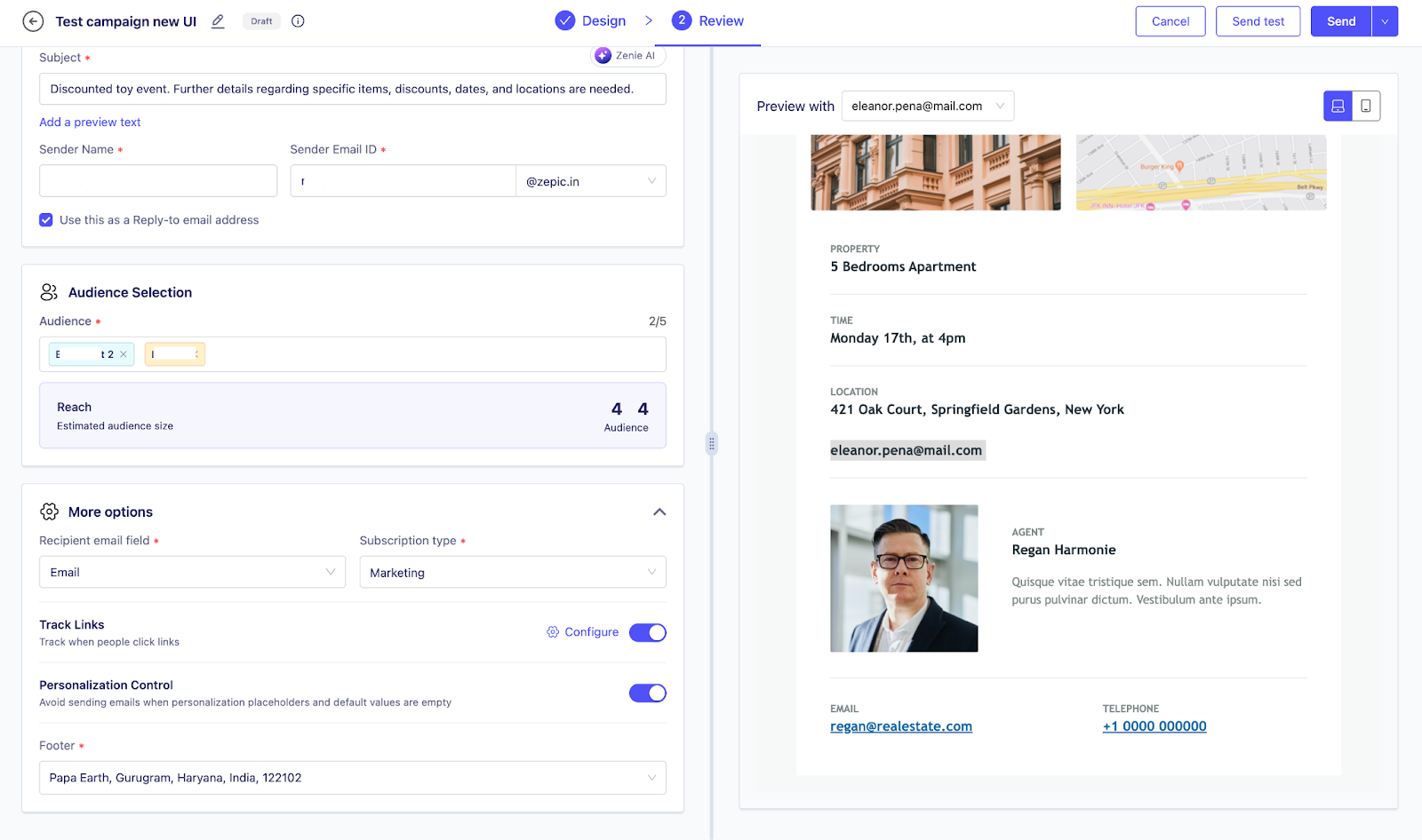 The email campaign setup process has been simplified, reducing the number of steps required to launch campaigns. Sender and reply-to information are now pre-filled automatically, and users can preview how personalization merge tags will appear with actual contact data directly in the preview window, without needing to send test emails first.