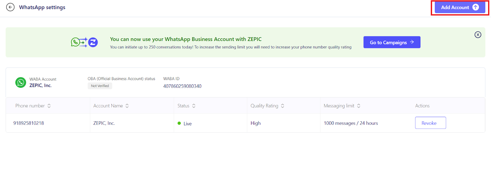 Confirm Status: The number will show as Active in your ZEPIC WhatsApp Sender settings.