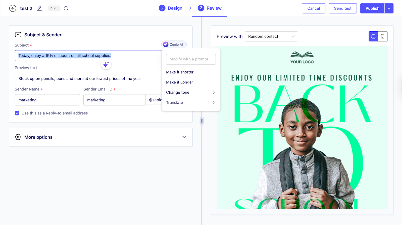 ZENIE now automatically generates subject lines and preview text for email campaigns when not provided. Based on the email content created, ZENIE suggests compelling copy that users can edit, helping prevent campaigns from being sent without these critical elements and ensuring every email has optimized messaging for better engagement.