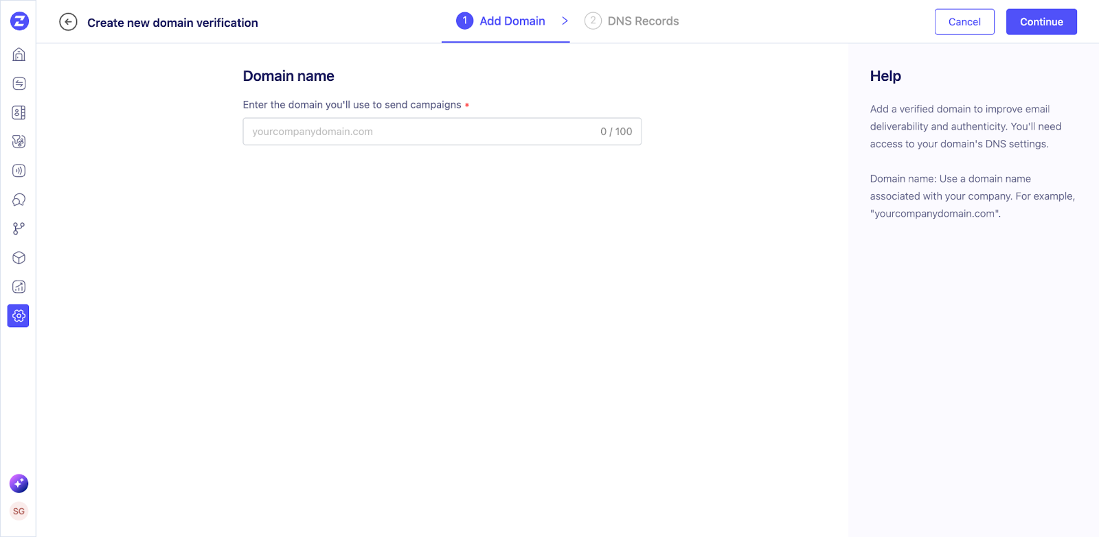 The email domain configuration process has been streamlined significantly. Users now only need to enter their domain name to get started, with ZEPIC handling the technical setup automatically. This simplified workflow makes domain authentication faster and more accessible, removing complexity from the DNS verification process.