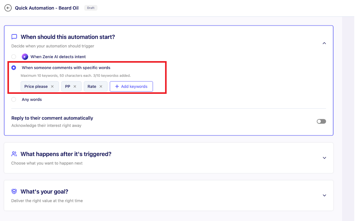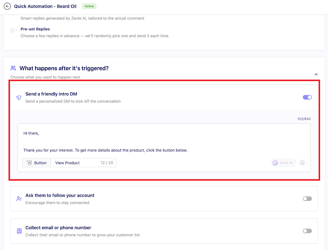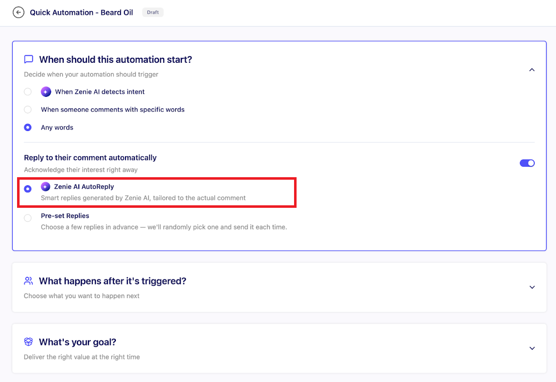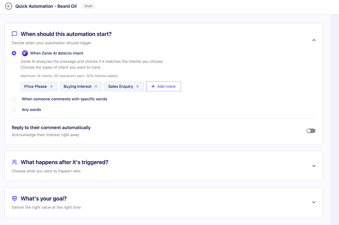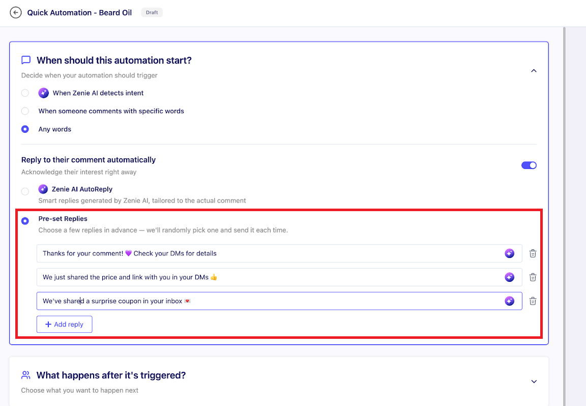 2. What actions should happen after it starts? (Reply to comment, intro DM, etc.)