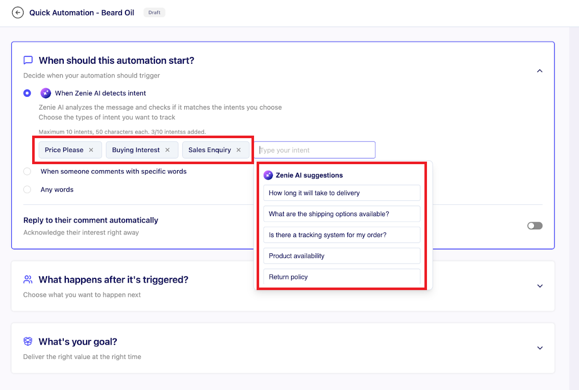 Zenie AI understands meaning, not just keywords. By default, ZEPIC can identify intents such as Price Enquiry, Buying Intent, and Sales Inquiry.