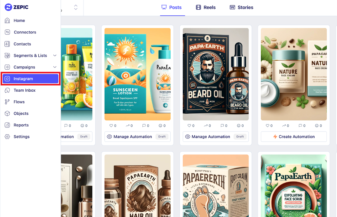 This article explains how to automate your Instagram Story replies using ZEPIC. To illustrate this, imagine PapaEarth—a brand that wants to automatically respond to any user who replies to their story asking for pricing details.