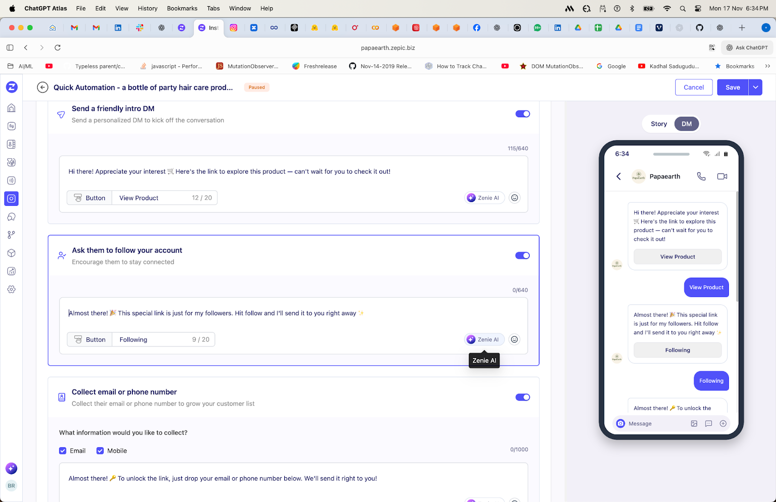 When someone replies to your story with pricing intent → they receive an intro DM → ZEPIC verifies if they follow → collects email/phone → sends product details.