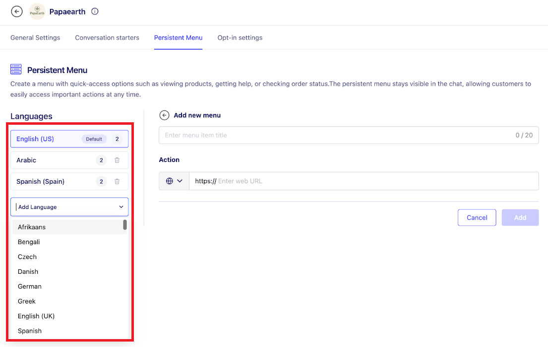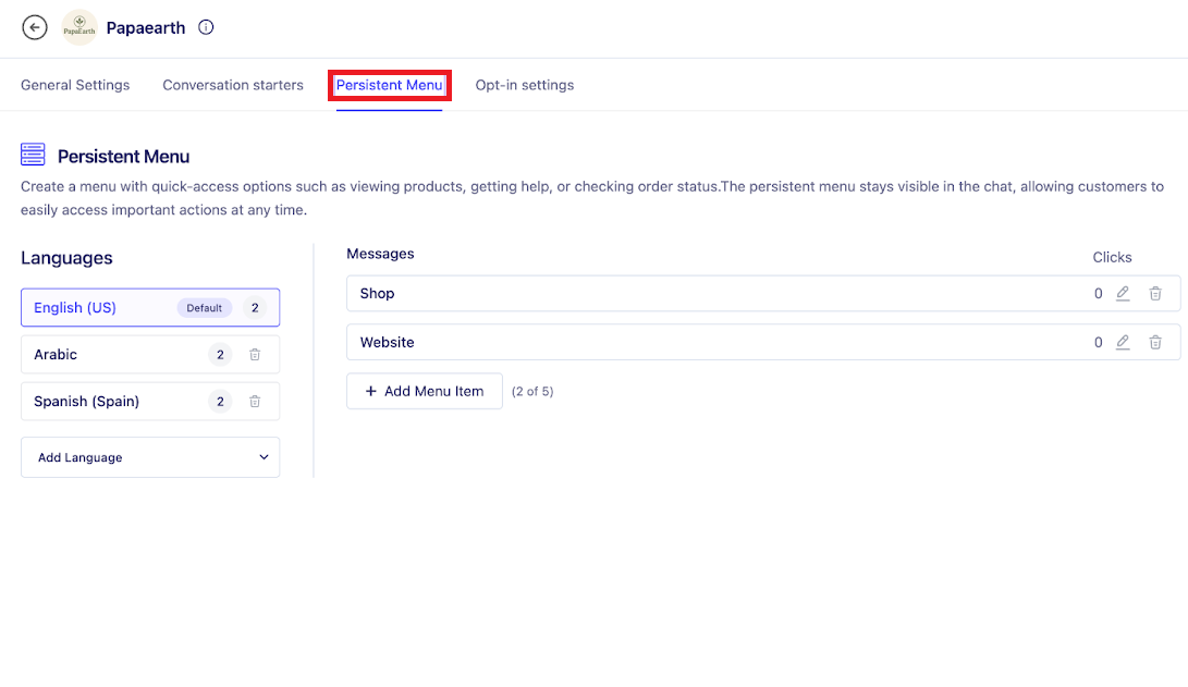 A persistent menu provides quick access options such as viewing products or visiting your website. We’ll show how to add menu items in English, Arabic, and Spanish.