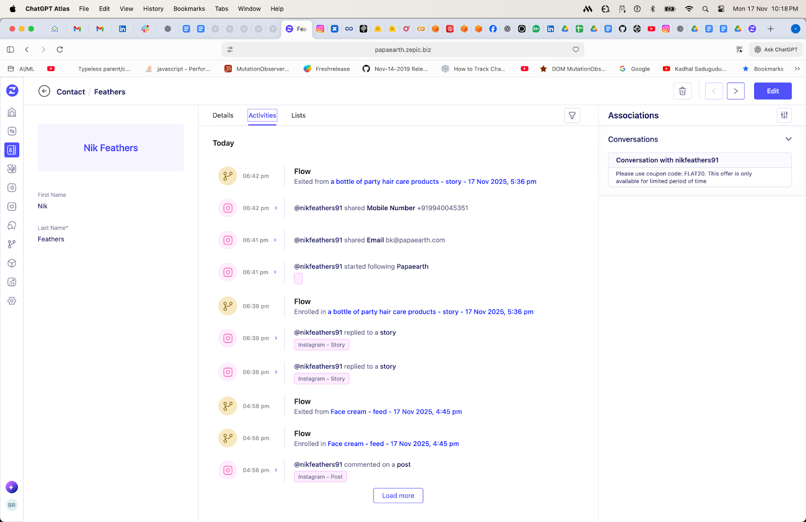 When a user interacts with your business, ZEPIC creates a contact record. All the user activities will be recorded for the user. You can view all the activities, profile information in the user 360 degree profile view (Navigate to Contacts, and click the record)