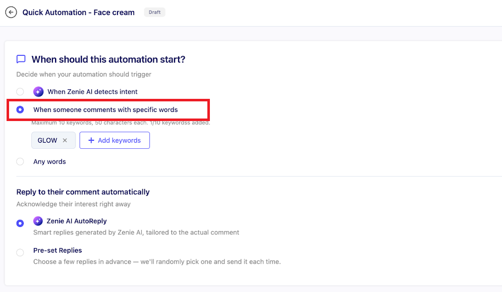 “Choose when someone comments with specific words” option and add the keyword “GLOW”