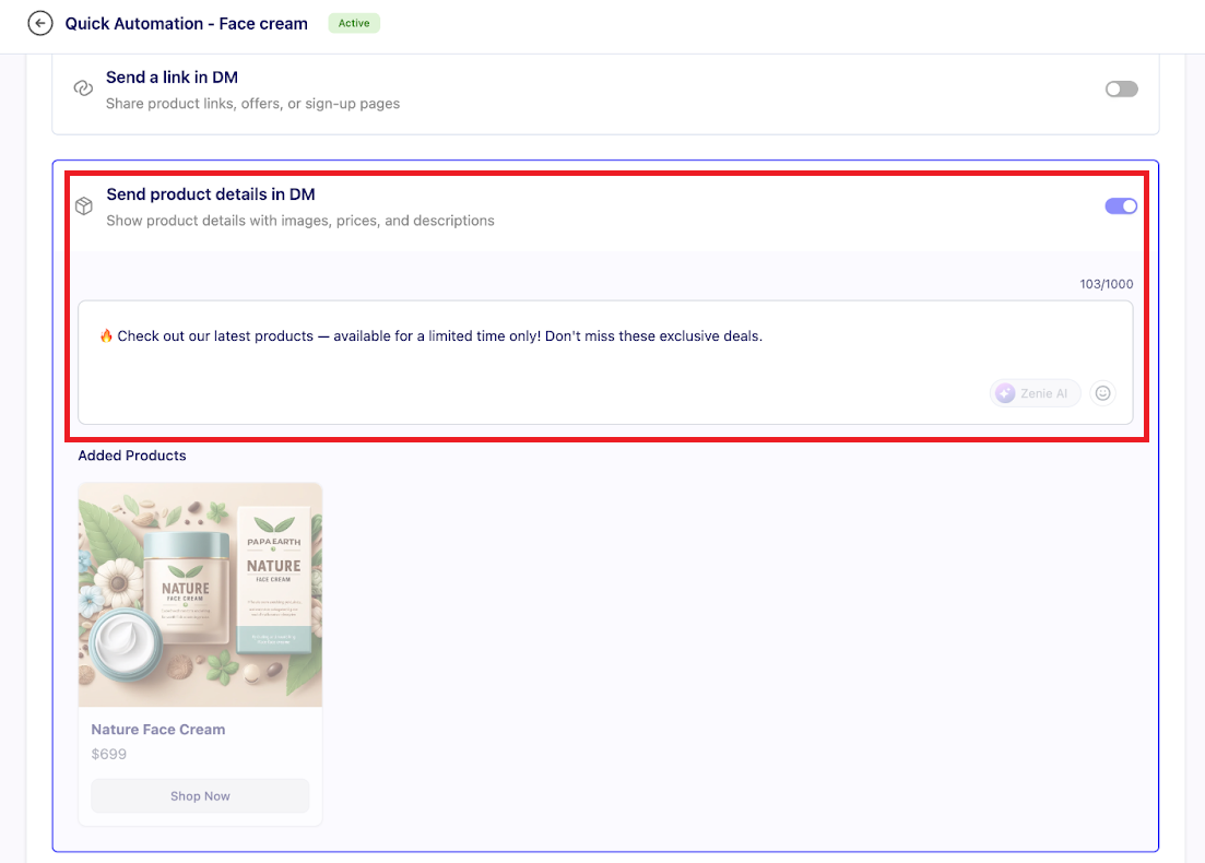Sending the product details in DM