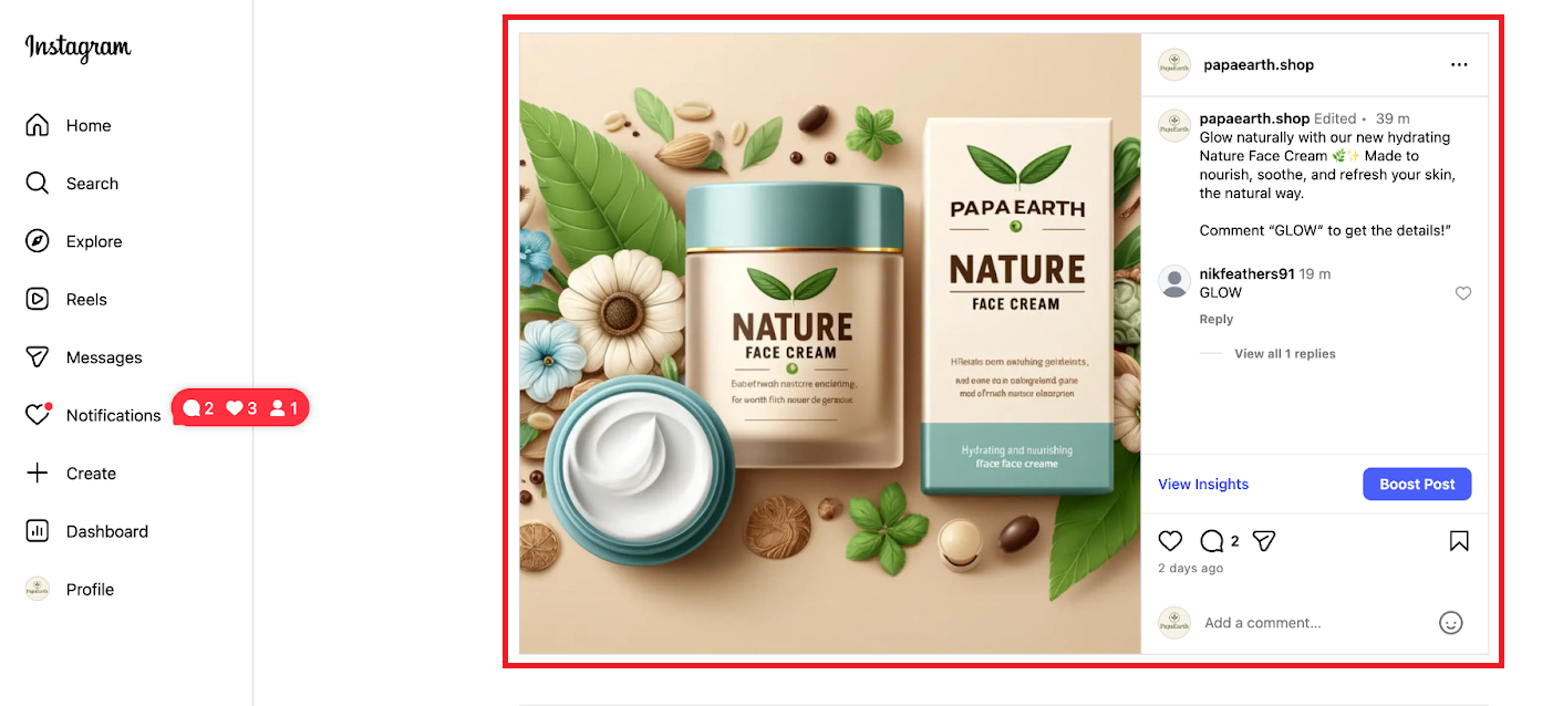 Whenever a user comments “GLOW” on the Instagram post: