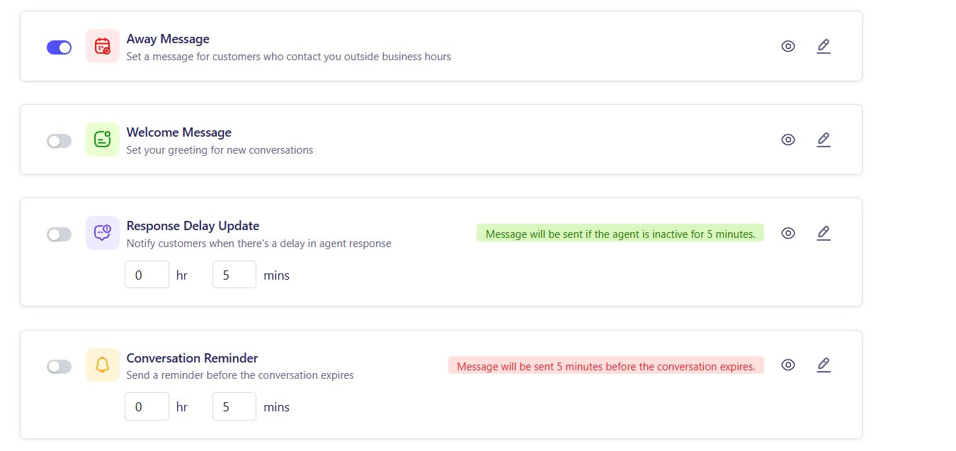 - You will see options for Away Messages, Welcome Messages, Response Delay Updates, and Conversation Reminders.