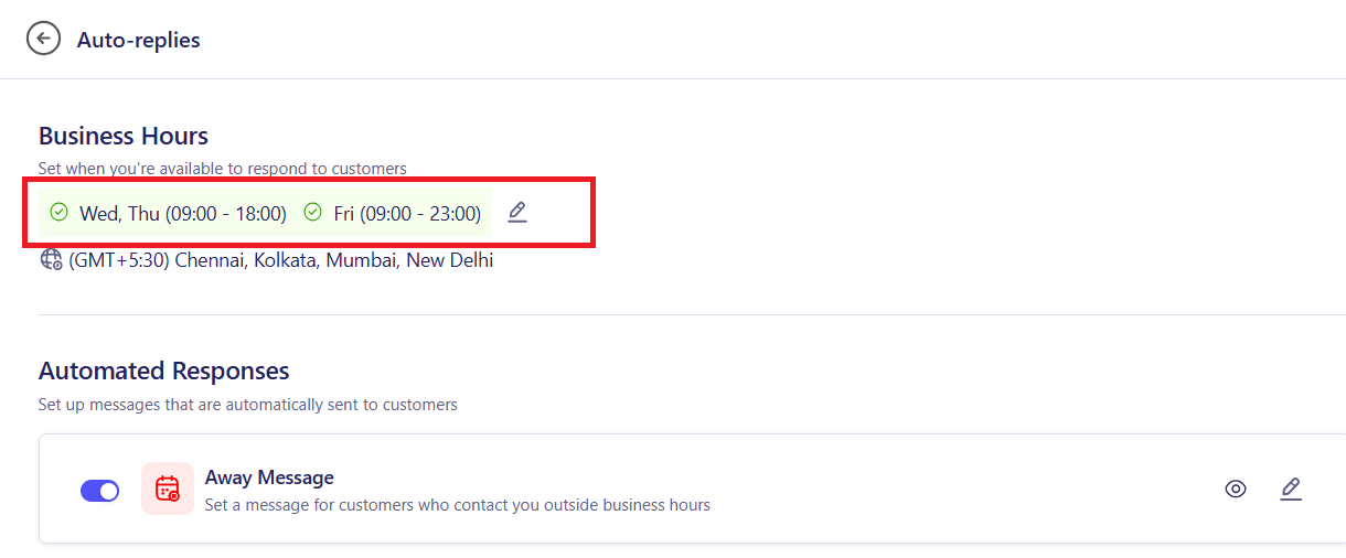 - Define your working days, times, and Time Zone. This data powers the logic for "Outside Business Hours" or Away auto-replies.