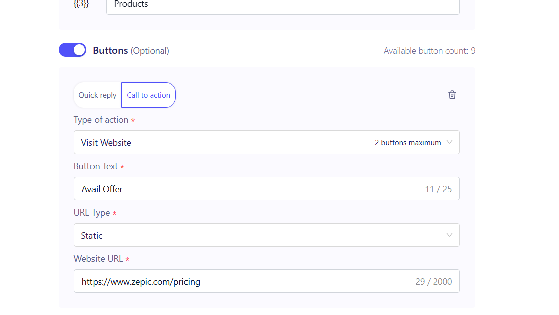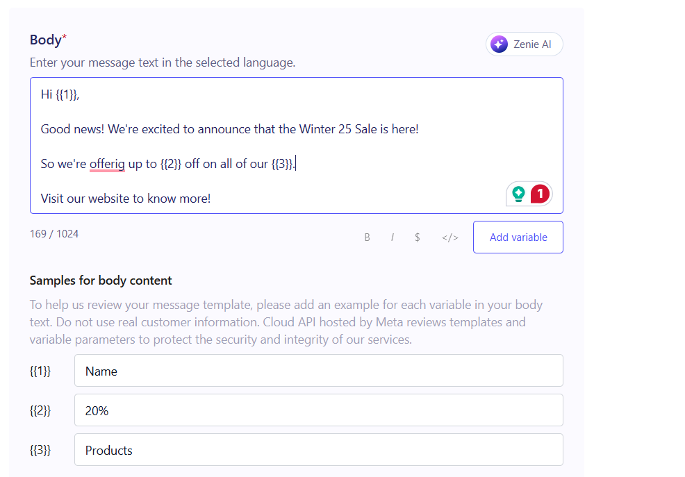 - Template Body: Write the exact text. Your message must not contain promotional content if the category is "Utility."