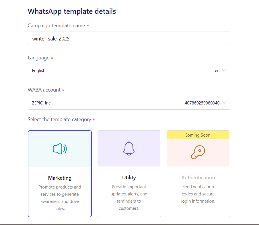 - Category: Select the primary purpose (e.g., Marketing for promotions, Utility for transactional alerts like shipping updates, or Authentication for OTPs).