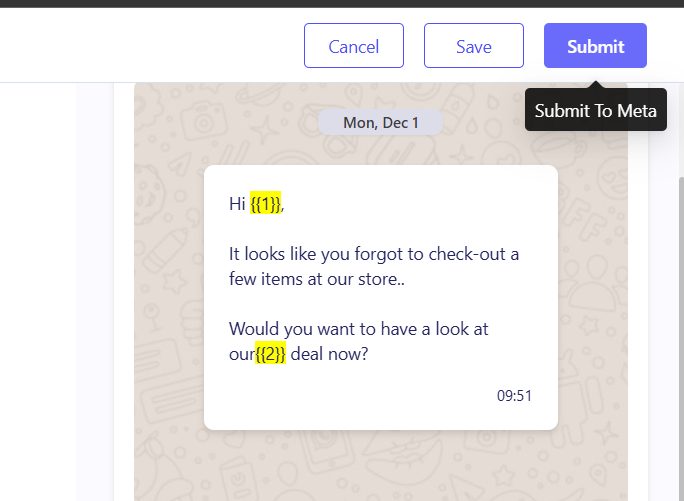 To show Meta exactly how the message will look to the customer, you must replace the placeholders with sample text.