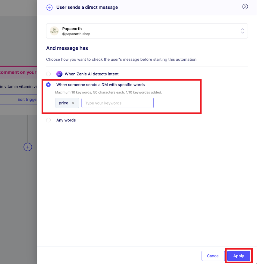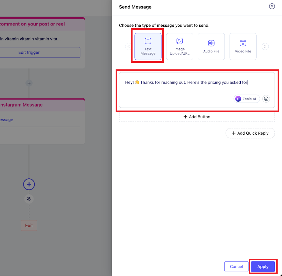 Automatically send a DM to the user. You can send Text, Image, Video, Audio, Card, or Carousels.