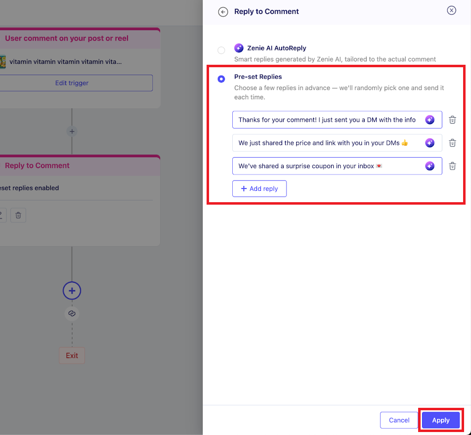 Reply publicly to the user on the post. This increases post engagement and drives users into your inbox. Use Zenie AI Autoreply for contextual responses.