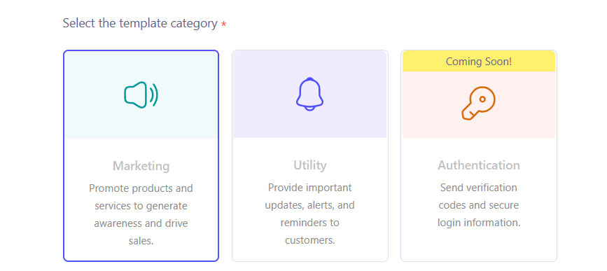 Meta reviews templates based on their group. Use Marketing for promotions and Utility for order updates to ensure approval.